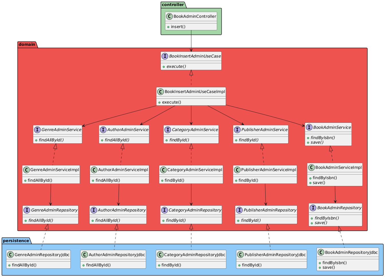 De esta forma, podríamos tener separados los casos de uso en los de admin, user y los comunes, los cuales llamarían a los servicios correspondientes (que serían los mismos para todos los casos de uso). Por ejemplo, tendríamos el caso de uso común BookCountUseCase: