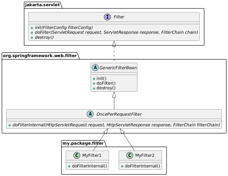 Existen muchas formas de definir filtros, aunque una práctica común es implementar la interfaz jakarta.servlet.Filter o alguna de sus clases herederas. En nuestro caso, vamos a usar la clase abstractaOncePerRequestFilter.