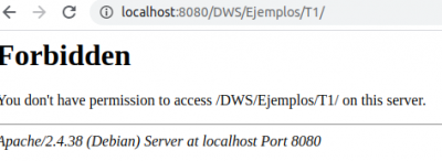 Nuestro archivo se llama holaMundo.php, y para acceder a él desde el navegador tenemos que poner la url completa y el nombre del fichero. Si intentamos acceder a http://localhost/DWS/ejemplos/T2 sin especificar el nombre del archivo, el navegador nos dirá que no tenemos permiso para acceder a esa url (en realidad lo que está pasando es que no sabe qué archivo abrir en esa ubicación).
