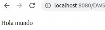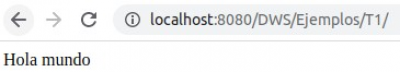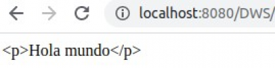 Vamos a ejecutar nuestro archivo holaMundo.php de forma que podamos ver el resultado esperado en nuestro navegador. Arranca el servidor Apache y accede a la siguiente url: http://localhost/DWS/ejemplos/T2/holaMundo.php . Si todo ha ido bien, deberías ver algo parecido a ésto en tu navegador (el puerto 8080 detrás de localhost no tienes porqué verlo en tu navegador. Incluso puedes ver otro diferente si has modificado el puerto en el que escucha Apache):