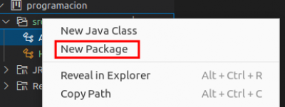 Para crear un paquete en Java, simplemente debemos definir su nombre al principio del fichero mediante la palabra reservada package. Como vimos en los primeros temas, este proceso lo podemos simplificar si utilizamos algún IDE. Por ejemplo, en VSC podemos usar la orden New Package para crear un nuevo paquete. Cualquier clase que creemos dentro de ese paquete ya tendrá incorporado la definición del paquete al principio del fichero: