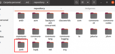Como hemos dicho antes, Maven busca las librerías primero en un repositorio local. Este repositorio está situado en <USER_HOME>/.m2/repository (aunque Maven nos permite cambiar esta localización por defecto). Si vemos el contenido del repositorio, encontramos la librería junit: