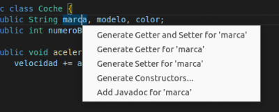 También podemos generar los getters y setters de todos los atributos si pinchamos sobre la clase y elegimos Generate Getters and Setters: