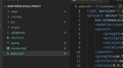 A continuación nos pedirá la versión (seleccionamos la última), el lenguaje (Java), el group id(com.fpmislata) y artifact id (daw-prog-eval2-prac1), el tipo de compresión (Jar) y la versión de Java que vamos a utilizar (17).