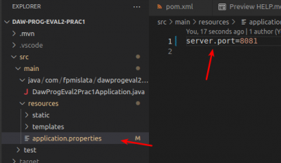 Para cambiar el puerto en el que escucha el servidor embebido de Spring Boot, la manera más rápida y fácil es añadiendo la siguiente línea al archivo application.properties de la carpeta resources: