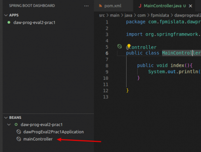 Fíjate que en la línea anterior a la definición de la clase hemos añadido la anotación @Controller (asegúrate de importar la librería org.springframework.stereotype.Controller para que funcione). Con esa notación, le indicamos a Spring que queremos crear un Bean de tipo controlador. Existen varias anotaciones diferentes para crear Beans de Spring, pero nosotros, por ahora, vamos a utilizar controladores y poco más. Si miramos el Dashboard de Spring Boot en VSC veremos el Bean recién creado: