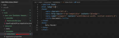 Para cargar una plantilla desde nuestros controladores, primero vamos a crear el archivo index.html en la carpeta resources/templates (puedes mostrar lo que quieras en el <body> del HTML):