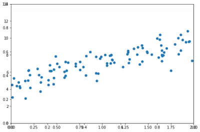 fig, axes = plt.subplots(figsize=(9,6)) axes = fig.add_subplot() plt.axis([0 ,2, 0, 14]) axes.scatter(X,y)