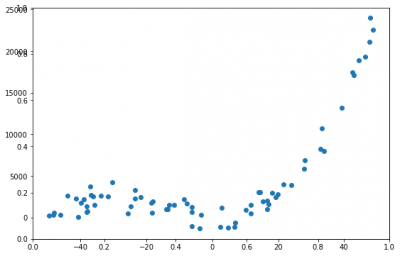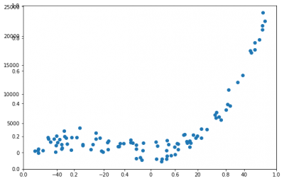 fig, axes = plt.subplots(figsize=(9,6)) axes = fig.add_subplot() axes.scatter(df.X,df.y)