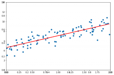 fig, axes = plt.subplots(figsize=(9,6)) axes = fig.add_subplot() plt.axis([0 ,2, 0, 14]) axes.plot(X, y_predict, color="r") axes.scatter(X,y)