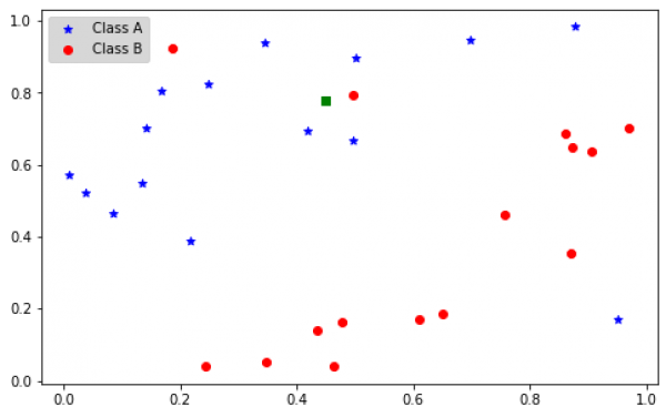 Una cuestión sería elegir el número (K) de muestras cercanas en las que nos deberíamos fijar. Si elegimos k = 1, el modelo asignará a la nueva muestra la clase B. Si asignamos k = 3, el modelo asignará la clase A.