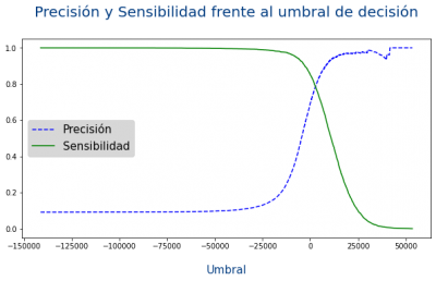 Vemos que la precisión empieza a bajar bruscamente a partir del 80% de la sensibilidad, con lo que podemos elegir una combinación precisión/sensibilidad justo antes de ese descenso.